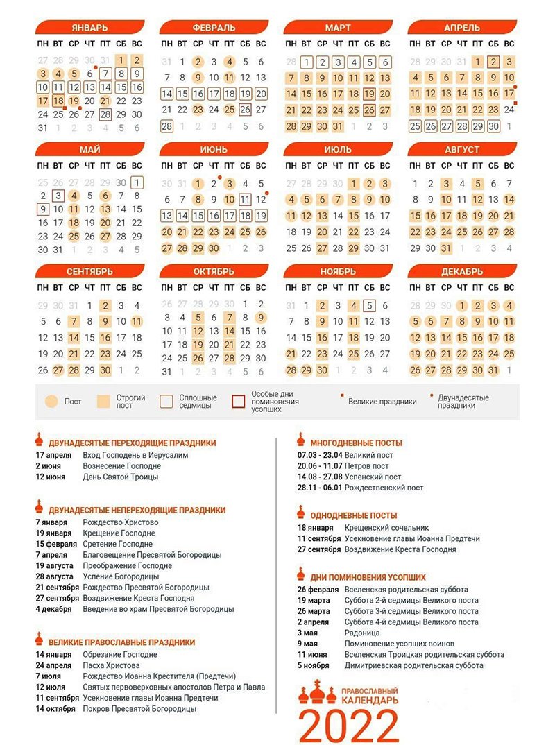 Внимание! Все даты переходящих торжеств в православном календаре зависят от того, когда в 2022 году состоится Пасха.